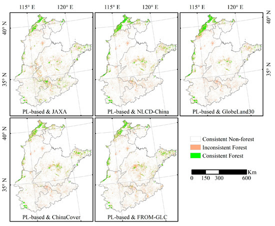 The spatial distribution of the PL-based and the other five forest maps are shown in Figure 5. All the maps show an intensive forest distribution in the mountainous regions, e.g., northwestern part and the Mountain Tai region, while in the plain region, the traditional agricultural production region, only PL-based and JAXA forest maps show the widespread spatial distribution of forest. That indicates that the PALSAR-based forest maps tend to capture more forests with lower forest coverage that is mainly distributed in a large number of patches with mixed pixels.