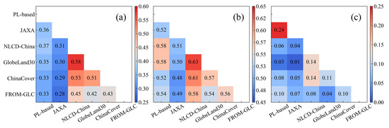 In detail, the spatial consistency index of the forests between PL-based and other forest maps is relatively low. In the NCP (Figure 10a), the highest spatial consistency index of the forests is presented between the NLCD-China and GlobeLand30 forest maps (0.58), while the lowest spatial consistency index of the forests is shown between the JAXA and FROM-GLC forest maps (0.28), and the spatial consistency index of the forests between PL-based and JAXA forest maps is 0.36. In the mountain region (Figure 10b), the highest spatial consistency index of the forests is presented between the NLCD-China and GlobeLand30 forest maps (0.63), while the lowest spatial consistency index of the forests is shown between JAXA and ChinaCover forest maps (0.48). In the plain region (Figure 10c), the highest spatial consistency index of the forests is presented between the PL-based and JAXA forest maps (0.24), while the lowest spatial consistency index of the forests is shown between the JAXA and GlobeLand30 forest maps (0.01). It is remarkable that the NLCD-China, Globeland30, ChinaCover, and FROM-GLC forest maps are generated based on Landsat data, which has a higher spatial consistency index of forests with each other, while the PL-based and JAXA forest maps are generated based on PALSAR data, which have lower spatial consistency index of forests with optical products.