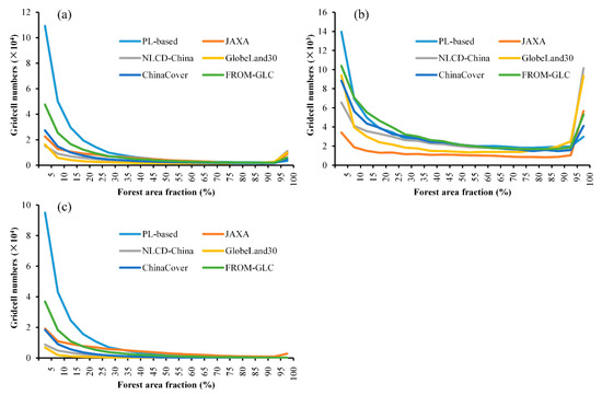 The PL-based forest map can capture more details of forests, i.e., forest patches, than the other five forest maps (Figure 6). Here, we aggregate the 30-m forest maps into 900-m gridcells with forest fraction values, to investigate the frequency of different sizes of forest patches. Figure 11 shows the distribution of areas with different forest densities using the forest fractional gridcells at 900-m resolution. The results show that the PL-based forest map has a higher frequency in the low forest proportion gradients than the other five forest maps, followed by the FROM-GLC (Figure 11a). That means the low proportion of forests can be better identified in the PL-based forest map.