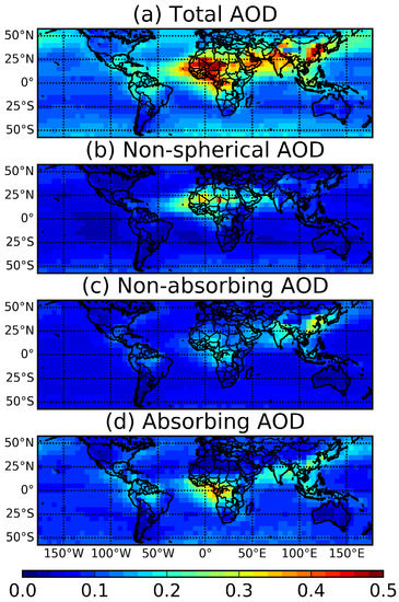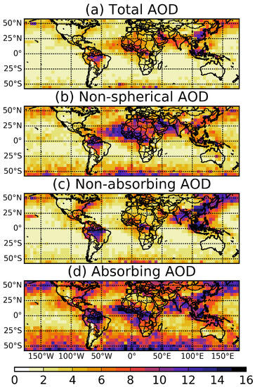 To assemble our statistics, we utilized the seasonally and annually averaged AODs for all aerosols (hereafter referred to as total AOD), non-absorbing aerosols (non-absorbing AOD), absorbing aerosols (absorbing AOD), and non-spherical aerosols (non-spherical AOD) reported at a wavelength of 558 nm over the 17-year period from March 2000 through February 2017. The monthly mean AOD was calculated using the gridded Joint Aerosol Product Version F01_0001(JOINT_AS) [15]. The spatial resolution of the JOINT_AS product is . There are other MISR aerosol products that provide total AOD and non-spherical AOD at a higher spatial resolution than JOINT_AS. However, JOINT_AS is the only MISR product that provides gridded AODs for the eight different particle types assumed in the retrieval algorithm. Figure 1 presents maps of the AODs for total, non-spherical, non-absorbing, and absorbing aerosols averaged over the entire time period. The major emission sources of the three particle types are well characterized. For example, the Sahara Desert is the largest source of non-spherical aerosols in the world (Figure 1b). Non-absorbing aerosols, such as sulfate and nitrate, are primarily emitted from anthropogenic sources in China and India (Figure 1c). Savanna grassland fires emit a large number of absorbing aerosols over Central Africa [32] and biomass burning sources in the Amazon and Indonesia are also apparent, along with anthropogenic sources of absorbing aerosols in China and India (Figure 1d). The non-spherical, non-absorbing, and absorbing AODs from JOINT_AS have been shown to be comparable to model-simulated AODs for sulfate aerosols, carbonaceous aerosols, and dust, respectively [15].