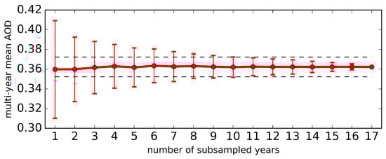 As more AOD data from satellites become available, different studies use different averaging periods to define what they consider to be an appropriate AOD climatology. For example, AODs averaged for five and nine years were defined as the aerosol climatology in Remer et al. [8] and Sreekanth [9] respectively. Pan et al. [4] used satellite-derived AOD averaged for the eight years between 2000 and 2007. The six-year mean AOD between 2000 and 2005 was compared with model simulations in Misra et al. [10]. More recent studies define AOD climatologies as the mean of AOD over a longer period of time than 10 years. In Aklesso et al. [11], the AOD climatology is an averaged AOD between 2005 and 2015. Kumar et al. [12] investigated the mean and variability of AOD over Kazakhstan between 2003 and 2015. In Boiyo et al. [13], Hu et al. [14], AOD climatologies represent temporally averaged AOD for the 14 years between 2002 and 2016. Even so, these inconsistent uses of the concept of an AOD “climatology” based on satellite observations along with the significant interannual variability in AOD reported in many studies (e.g., Lee et al. [15]) identify a clear and urgent need to objectively quantify the sensitivity of multi-year mean satellite-derived AOD “climatology” to the length of the observation periods.