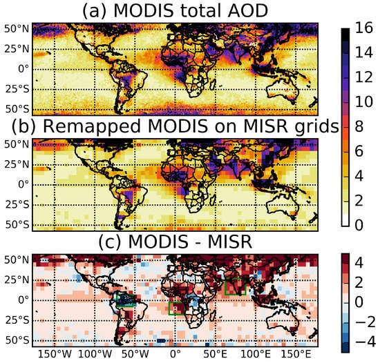 To test the validity of this approach, we also used the total AOD from MODIS for the same 17-year period. For this study, the MODIS Collection 6 Level 3 AOD over ocean and land at a horizontal resolution of retrieved using the Dark Target [35] and Deep Blue [36] algorithms respectively, was used. The wider swath of MODIS, 2330 km compared to MISR’s 400 km, assures better spatial coverage in the MODIS AOD product compared to that from MISR. To provide a more direct comparison, we further aggregated and averaged the higher resolution MODIS AOD dataset to the coarse grids of the MISR JOINT_AS product. Note, however, that the MODIS AOD product does not contain the particle type information provided by the MISR aerosol retrieval.