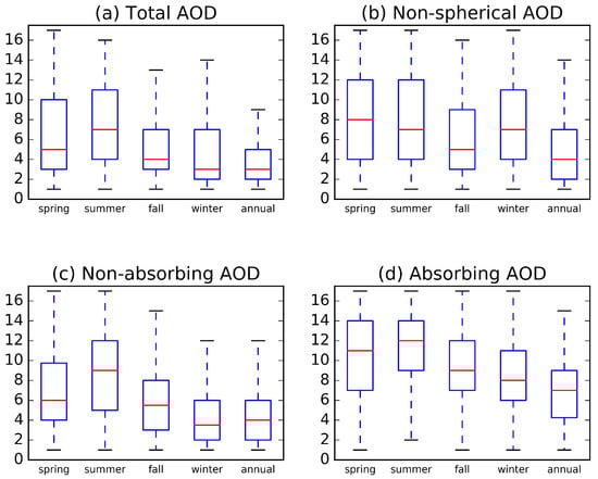 Figure 5 summarizes the stability of MISR’s speciated AOD climatologies for each season. The red lines in Figure 5 show the global median of the minimum record lengths required to obtain a sample standard deviation less than the predefined threshold (0.01 for total AOD, 0.004 for non-spherical AOD, and 0.005 for non-absorbing and absorbing AODs). Please note that each distribution represents the minimum record lengths quasi-globally ( S– N) only over land to exclude the noisy signals over ocean at high latitudes. The blue boxes represent lower and upper quartiles of the minimum record lengths, so 75% of the data fall within these ranges. For the annual mean AOD, the global median value is about three years for the total MISR AOD and up to about seven years for the MISR absorbing AOD. These results provide confidence in the multi-year global mean AODs that have been used as proxies for the “climatological” AOD in previous studies using satellite data. Moreover, the results suggest that the MISR AOD observations over 17 years and its temporal subsets may provide enough information to examine global mean speciated AODs and, possibly, their radiative forcing with quantitative uncertainties (e.g., Xu et al. [40]).