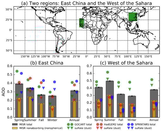 (a) Maps of the two regions, East China and west of the Sahara Desert. (b) Seasonal cycles and averages of total AOD (black bars) and non-absorbing AOD (orange bars) from MISR over East China. The error bars represent uncertainties due to the 5-year subsampling. The dots and triangles represent the corresponding total and nonabsorbing AOD from the three AEROCOM models. (c) Same as (b) but for total and non-spherical AOD in west of the Sahara Desert.
