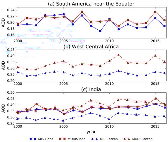 Time series of annual mean AODs from MISR (blue) and MODIS (red) between March 2000 and February 2017. The AODs on MISR JOINT_AS’ grid points are spatially averaged over the three green boxes in Figure 4c. (a) South America near the Equator. (b) West Central Africa. (c) India. Solid and dotted lines represent AODs averaged over land and ocean respectively.