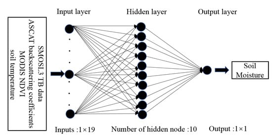 In the learning phase, NN aims to minimize the loss function between the estimated SM and the corresponding ERA-Interim product y. This can be addressed by a classical back-propagation algorithm [40,41]. In this paper, we use the gradient backpropagation with the Levenberg–Marquardt algorithm [42]. In addition, we use the Min-Max normalization method to scale all data into the range [0,1] because it can avoid unnecessary numerical problems and make the network converge quickly. It is realized by the following: