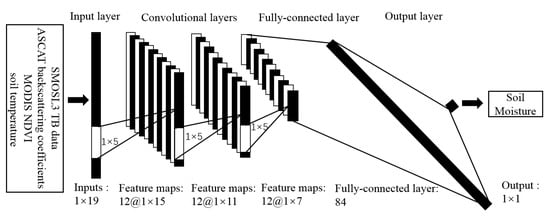 Different from NN, deep NN (DNN) extends the number of hidden layers to two or more, thus improving the learning and generalization abilities of networks. As a kind of DNN, DCNN has been popularly employed in the field of remote sensing [43,44,45]. Inspired from them, we also design a DCNN for SM retrieval. The architecture of the designed network is shown in Figure 2, which consists of an input layer, three convolutional layers, one fully-connected layer, and an output layer. The same as NN, the input data of DCNN is also a 19-dimensional vector. Thus, we use a one-dimensional convolutional operator in each convolutional layer. The size and the number of convolutional kernel are and 12, respectively. We select three convolutional layers because it can achieve better results than more numbers of convolutional layers, which will be discussed in Section 4.3.