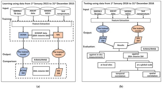 As shown in Figure 3, our experiment consists of two phases: the learning phase from 1 January to 31 December 2015 and the testing phase from 1 January to 31 December 2016. In the learning phase, preprocessing is first conducted, and then hyperparameters are selected. After the training, SM estimates are obtained from NN and DCNN methods, respectively, and we compare their performance against ERA-Interim SM. In the testing phase, the trained models obtained from learning phases are applied to the testing data, and then we evaluate the retrieval quality of DCNN and NN by comparing with both in situ measurements and ERA-Interim SM. The evaluation against ERA-Interim SM also contains two parts, at the grid cells where the in situ stations are located and at a global scale.