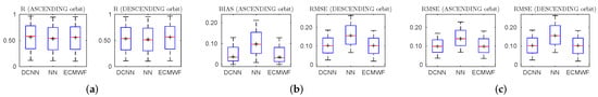When compared with in situ measurements, we compute the temporal correlation between different SM retrievals (DCNN SM, NN SM and ERA-Interim SM) and the in situ measurements in the testing phase. It is found that DCNN SM agrees better with in situ measurements than NN SM (Table 1). The mean value of R between DCNN SM and in situ measurements is higher than that between NN SM and in situ measurements by for SMOS ascending overpass, while the mean value of R between DCNN SM and in situ measurements is higher than that between NN SM and in situ measurements by for SMOS descending overpass (Table 1). Furthermore, box plots in Figure 5a show that the median values (the red line) of R between DCNN SM and in situ measurements are also slightly higher than those between NN SM and in situ measurements. Figure 5b,c demonstrate similar findings as Figure 5 from the other evaluation metrics and .