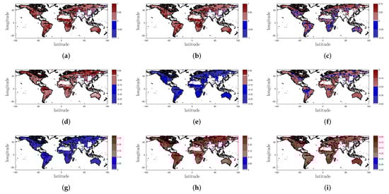 Spatial distribution of R (the top panels), (the middle panels), (the bottom panels) between the time series of DCNN/NN SM and ERA-Interim SM for SMOS ascending overpass in the testing phase. (a) R between DCNN SM and ERA-Interim SM; (b) R between NN SM and ERA-Interim SM; (c) difference in R (a minus b); (d) BIAS between DCNNM SM and ERA-Interim SM; (e) between NN SM and ERA-Interim SM; (f) difference in ( minus ); (g) between DCNN SM and ERA-Interim SM; (h) RMSE between NN SM and ERA-Interim SM; (i) difference in (g minus h).
