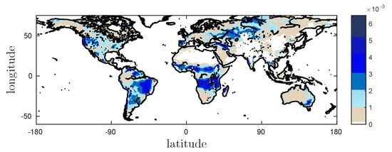 Additionally, according to the previous study in [12], there are some connection between the temporal correlation and the variance of the time series for the target data. From Figure 6a,b and Figure 8, we find that regions with a lower temporal correlation are those areas whose variance of ERA-Interim SM time series are relatively low, while regions with a higher temporal correlation are those regions whose variance of ERA-Interim SM time series are relatively high.