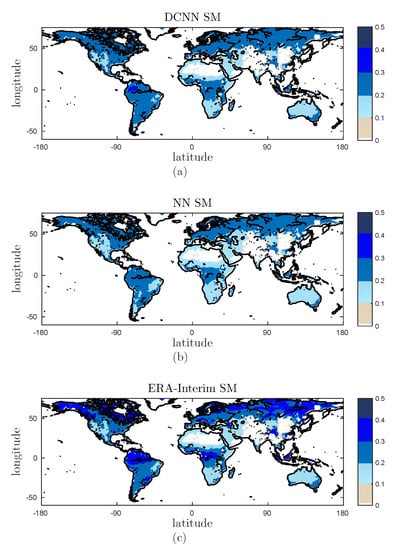Secondly, we evaluate DCNN/NN SM against ERA-Interim SM from the perspective of temporal dynamics. In order to validate whether DCNN and NN capture the temporal variability of the ERA-Interim SM, we compute R, and between the time series of DCNN/NN SM and ERA-Interim SM for each gird at a global scale.