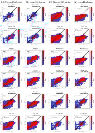 Although similar spatial correlations between DCNN/NN SM and ERA-interim SM is found at the annual scale, their agreements vary in different months shown in Figure 10. First, the number of data used in each month is different. Specifically, the data in January, February, November, December are apparently fewer than those in other months. Second, DCNN achieves better retrieval results than NN in February, May, September, October, November and December; NN achieves better retrieval results in January, July and August; DCNN and NN achieve similar results in March, April, and June.