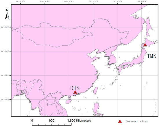 In this research, we selected Dinghushan (DHS) and Tomakomai (TMK) as the research areas. Both of these areas have dense forests and a conspicuous vertically stratified vegetation structure during the growing season from April to October. DHS, which is located in a monsoon subtropical forest climate zone in the southeast part of China, has a 15 m-high broadleaved forest canopy, while TMK, which is located in the northeast part of Japan, has a 15 m-high deciduous needle leaf (DNF) canopy. Vertical meteorological and canopy eddy covariance (EC) data were measured at both sites. A certain amount of understory LAI (>0.9 m2/m2) was found in these two sites during the growing season. Two selected sites’ detailed information is showed in Figure 1 and Table 1.