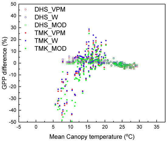 Differences in gross primary production (GPP) under different mean canopy temperatures. The GPP difference is calculated as (GPPm-GPPs)/GPPs. DHS_VPM, DHS_W, and DHS_MOD are the values calculated at the DHS site and by VPM, Wu’s method, and the MOD17 model, respectively.