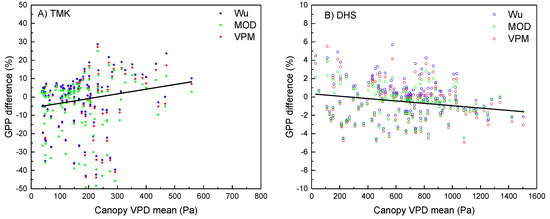 Effects of both considering and not considering the vertical differences in VPD on GPP. The black line is the fit line for the GPP difference scatterplot at different sites. Subfigures (A,B) are the GPP difference comparisons based on different canopy mean VPDs at TMK and DHS, respectively.