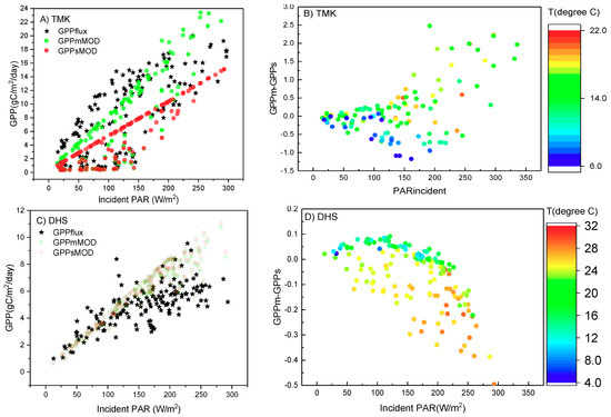 Moreover, at high temperatures at the DHS site, the estimation of GPPm is lower than the estimation of GPPs, and the difference between GPPm and GPPs increases with increasing incident PAR (Figure 8B,D). At the TMK site, the difference between GPPm and GPPs increases with increasing PAR, and reaches a maximum of approximately 70% of GPPs, which is much higher than that at the DHS site. When the incident PAR increases, the PAR reaching the understory also increases. Understory layers have higher LUE values, and GPPm is capable of considering the higher photosynthesis from understory components, which explains why GPPm is higher than GPPs. At the TMK site, GPPm is lower than GPPs when the temperature is low, which is the opposite pattern of that at the DHS site. The high temperatures at the DHS site and the low temperatures at the TMK site represent non-optimal growing temperature conditions, under which the biases between GPPm and flux tower-measured GPP are always lower than those between GPPs and flux tower-measured GPP with different degrees of variation at different sites. When the temperature enters the optimal growing temperature range, the estimation of GPPm is higher than that of GPPs, which considers the high photosynthesis capacity of the understory.
