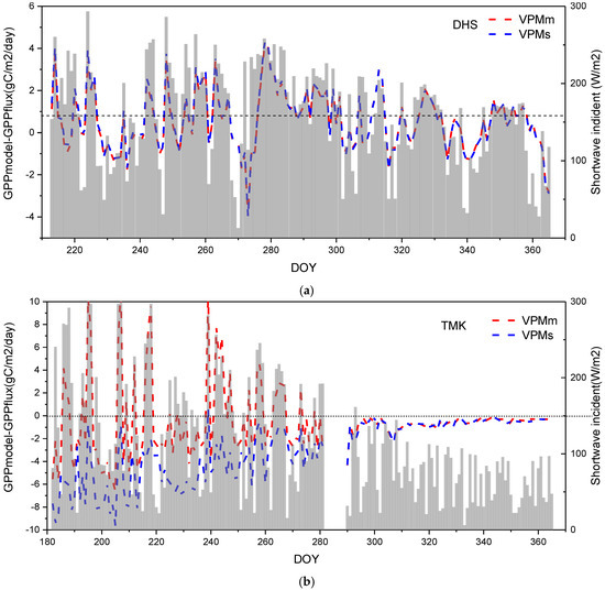 The GPP bias (GPPdif in Equation (7)) is the multilayer GPP result (GPPm) minus the single-layer GPP result (GPPs), which represents the difference between the two models. Therefore, GPPdif is the difference between considering and not considering vertical stratification. TMK and DHS have overstory and understory vegetation, so using representative GPPs for the whole canopy would lead to estimation uncertainties. The modeled GPP values produced by a variety of models were given their own terms. For example, if a GPP result was produced without considering the vertical structure in a VPM, this value was represented as GPP_s_VPM. If a GPP result was produced based on a MODIS model that considered the vertical structure, it was represented as GPP_m_MOD.