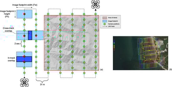 The image footprint on the ground covered an area of approximately 90 m (3000 × 3/100) by 67 m (2250 × 3/100). We oriented the camera on the UAV so that the 67 m axis is parallel to in-track and 90 m axis along the cross-track direction. Since an in-track overlap (overlap between each photo along the transects) of 75% is recommended the UAV moved 17 m relative to the ground (75% of 67 m = 50 m; 67 − 50 m = 17 m) and took a photo. Thus, at 7 m/s GPS airspeed subject to wind) to maintain a sufficient overlap between photos, we needed to take photos every 2 s. We set the time lapse mode with auto white balance and exposure. Additionally, at least 65% cross-track overlap (overlap between consecutive transects) is required to ensure good results in orthophoto generation so the UAV flight lines were spaced no greater than 31.5 m (Figure 3a). According to these parameters, the camera positions and the image footprints, directly estimated from the open-source software APM Mission Planner (v. 1.3.34), are shown in Figure 3b. To perform programmed GPS missions (i.e., autonomous survey grids) we combined the drone’s APM with Mission Planner 1.3.5. Some important features of Mission Planner are that it can plan, save, and load autonomous missions into the autopilot using Google or Bing satellite maps. It is also able to record telemetry logs which contain information logs and, finally, it is possible to download and analyse mission logs created by the APM autopilot. To avoid water motion and reflections, we timed the survey to coincide with the virtual absence of wind, low tide and optimal location of the sun as suggested in Casella et al. [50].