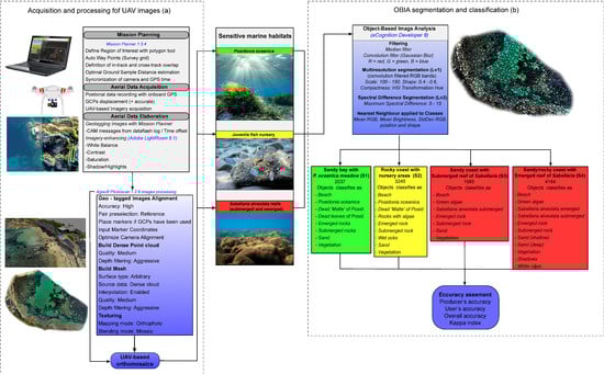 Typical acquisition and processing pipeline regarding acquisition, planning and processing of UAV-based aerial images (a) and object-based image analysis (OBIA) segmentation and classification of marine habitats (b).