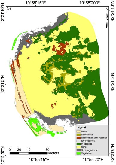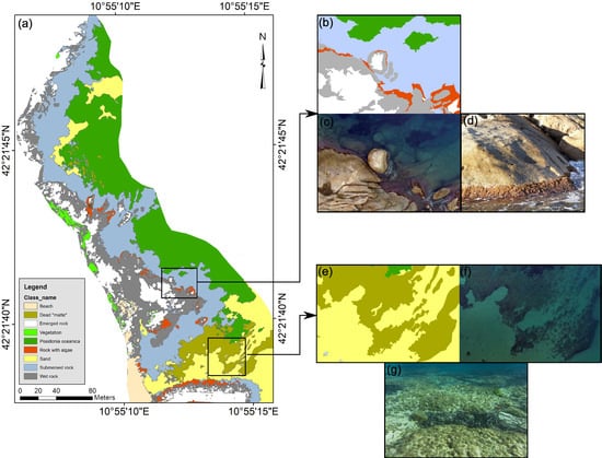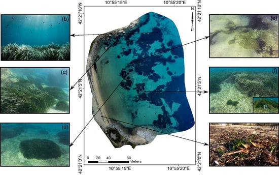 High-resolution orthophoto (2.76 cm/pix) of the Posidonia oceanica meadow in front of the beach of Cannelle (a). Important underwater features characterizing this environment are shown trough underwater photos used as ground truth data. P. oceanica seagrass meadow (b), patch formation of the seagrass on rocks (c) and sand (d), dead leaves of Posidonia oceanica lying on the sea bottom (e), impacted areas from boat anchoring with exposed root-rhizomes (f), and accumulation areas of beached leaves and rhizomes (g).