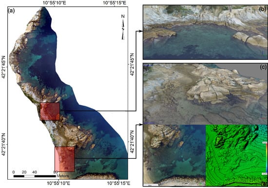 The case study for mapping juvenile sparid fish nursery areas was carried out along a rocky shoreline (~1 km long, coverage area: 0.0431 km2) north of Giglio Porto (Site S2). In this area, the coast is sheltered from winds blowing both southward and northward due to the presence of the harbour and of a natural promontory. From the orthomosaic generated by 160 overlapping images the high heterogeneity over the whole extent of the mapped area was clearly visible. Along this jagged coastline we identified two small coves (Figure 7a) were the presence of particular natural features such as sandy patches, pebbles and large boulders made such area suitable for settlement of juvenile sparid fish [42,65,66]. In fact, thanks to the high resolution (3 cm/pix) of the imagery after a visual inspection we were able to identify the most suitable habitats for juvenile fish of the genus Diplodus. Generally, sheltered areas with gently slope and the rocky substrates, colonized with shrubby brown algae (e.g., Phaeophyceae) characterized by the presence of sandy patches with coarse sand and pebbles, near to large boulders (diameter > 1 m) were particularly favourable for the settlement of Diplodus spp. In addition, by integrating the generated 3D outputs (e.g., point clouds and DEM with appropriate corrections due to two-media photogrammetry effects) also the structure of the coastal zones, such as the height of boulders and the main morphologies of seabed in the shallower areas can be assessed (Figure 7b,c).