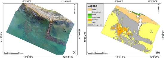 On the orthophoto (total area of about three hectares), representing a suitable area for the settlement of juvenile sparid fishes, the OBIA approach was implemented to classify nine cover classes. The classified image yielded an overall accuracy of 84% (Table S2). In terms of per class accuracy, all classes were relatively high (>70%), except for the classification of submerged rocks, wrongly classified as sand and dead “matte” of P. oceanica. However, classification of submerged rocks is difficult because of the lack of spectral contrast between the surrounding bottoms mainly due to absorption of light in the 550–750 nm spectral range by water molecules. In fact, emerged cover classes such as beach and dry rocks showed higher classification accuracies. The classified orthophoto (Figure 8a) clearly showed some important features characterizing these coastal environments. For instance, we reported the presence of brown macroalgae (especially Cystoseira spp., Figure 8b–d). This species is very important along rocky coasts because well-developed Cystoseira belt communities indicate good water quality [67] and, in general, arborescent macro-algae forests covering temperate rocky reefs are a known habitat for juvenile fish [68]. On the other hand, the southern part of the P. oceanica meadow presented an impacted area (represented by dead “matte”, Figure 8e–g) near to the port, probably due to the works for the expansion of the breakwater.