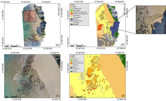 To evaluate the utility of the UAS-based imagery also along sandy coasts, characterized by the presence of Sabellaria alveolata reefs, two specific mission were carried out along Central Latium, approximately 33 km north (site S3) and 45 km south of Rome (Site S4). The two sites differ from each other because, in site S3, the biogenic reef is only present far from the coast, from 2 to 5 m depth. By contrast site S4 shows a Sabellaria reef also along the emerged part of the beach. In these areas, thematic map generation to highlight the characteristics of biogenic reefs is not an easy task, mainly due to water turbidity which often characterizes these shallow sandy environments. In addition, the polychaete worm Sabellaria builds its tube and forms large intertidal colonies by cementing sand grains with mucous secretions. Therefore, being made of sand, these reefs show a very similar spectral signature with neighbouring cover classes (sandy areas). However, despite these limiting factors, we achieved satisfactory classification accuracies (Tables S3 and S4) following OBIA workflow both for site S3 (Figure 9a,b) and for site S4 (Figure 10a,b). In fact, both sites had an overall accuracy >80%, however, site S3 showed a slightly lower level (moderate) of the Kappa index of agreement (0.77). As expected, the most misclassified classes were S. aleveolata bioconstructions (both considered as emerged or submerged reefs), incorrectly assigned to sandy areas of the bottom, emerged beach and submerged rocks. In addition, in site S3 also the submerged rocks tended to be misclassified as sand due to water turbidity and depth. Obviously, as in the other study cases a close examination of the imagery revealed variation in water surface perturbation throughout the orthomosaic (calm to light ripples, waves and whitecaps) that may have hindered classification of submerged features. Moreover, the accuracy of coastline segmentation and classification, depends on the complexity of the beach [33]. In fact, in complicated areas, such as the S4 site, where the beach is a mixture of rocks, algae formations, tree shadows and erosion gaps, the segmentation of the coastline is more difficult (inset of Figure 10b). Aside from the coastline, also the emerged sector of the reef consisting of small Sabellaria colonies (517 m2), are clearly visible over the whole extent of the mapped area (Figure 10c,d).