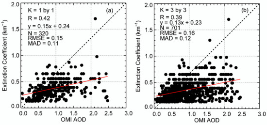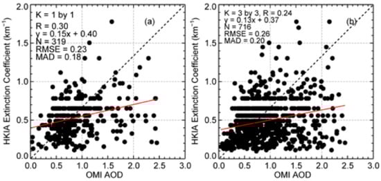 For kernel sizes of both 1-by-1 and 3-by-3 pixels, as well as at both VR stations, correlations between OMI AOD and Bext are lower than for other sensors, with R = 0.30 and 0.24 at HKIA (Figure 2) and R = 0.42 and 0.39 at HKO (Figure 3), respectively. These relatively low correlations may be due to the frequent overestimation of OMI AOD due to sub-pixel cirrus cloud contamination at the low (28 km) OMI resolution [56], as reported by [28,43]. That is, the OMI pixel size of 27.8 km2 can easily be mixed with thin-cloud cover, particularly in the vicinity the South China Sea region, where cirrus cloud frequencies are relatively high [57], and thus an underestimate of single scattering albedo occurs [58]. Additionally, the OMI AOD is reported at 483 nm, which is expected to experience more extinction than the human observation. This may also be the cause of high bias for OMI extinction.