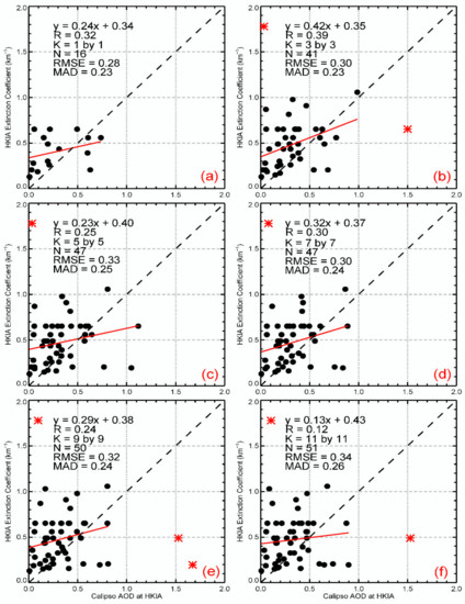 Low correlations are also observed between CALIOP AOD and Bext at both HKO (R = 0.47 and 0.17 for kernel windows of 9-by-9 and 11-by-11 pixels respectively; Figure 4a–c) and HKIA (R = 0.32, 0.39, 0.25, 0.30, 0.24 and 0.12 for kernel windows of 1-by-1 to 11-by-11 pixels, respectively; Figure 5a–f). It is important to note that all correlations are reported after excluding the potential outliers due to high AOD, which are highlighted in each figure as red asterisks. Furthermore, these outliers likely reflect unscreened artifacts and mixed pixels. Therefore, they can be treated as erroneous readings. These readings are not, however, excluded in designing the model for estimating visibility in the later part of the methodology. Low correlations from CALIOP may be due to its limitations in collecting data from near ground level during the day because of a lower signal-to-noise ratio in the presence of high solar background [59]. To overcome this problem, the CALIOP team uses a nighttime calibration constant to derive the daytime profiles. Even with this amendment, CALIOP is reported to underestimate AOD by a factor of two compared with AOD from a ground-based AERONET sunphotometer [60].
