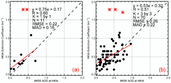 Correlation of Extinction Coefficient at HKIA with MISR AOD (17 km product at 558 nm) for kernel windows of (a) 1 by 1 and (b) 3 by 3. *—potential outlier in the data. Lines as described in Figure 2.