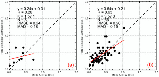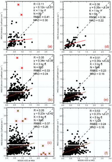 Like MISR, the MODIS AOD performs better at the urban HKO site than at the coastal HKIA (Figure 8). The correlations between MODIS AOD and Bext at HKO are 0.38, 0.51 and 0.53 for kernel windows (K) of 1-by-1, 3-by-3 and 5-by-5, respectively (Figure 8d–f), compared with 0.11, 0.35 and 0.26 (Figure 8a–c) at HKIA.