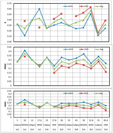 Great differences are observed in the R, RMSE and MAD between coastal (HKIA) and urban (HKO) areas (Figure 9). Figure 9 compares the R, RMSE and MAD at HKIA and HKO for increasing spatial resolution in the four sensors. The highest correlation at HKIA is for MISR AOD for kernel window of 1-by-1 (R = 0.60), followed by MISR AOD for kernel windows of 3-by-3 (R = 0.51) and CALIOP for kernel window of 3-by-3 (R = 0.39) (Figure 9 top). However, the highest correlation at HKO is for MISR AOD for kernel window of 3-by-3 (R = 0.63), followed by MODIS AOD with kernel windows of 5-by-5 (R = 0.53) and 3-by-3 (R = 0.51), respectively (Figure 9 top).