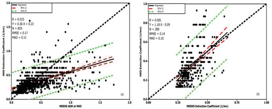 Correlation of Extinction Coefficient with MODIS AOD (10 km product at 550 nm) using Model-1 for HKO: (a) linear regression of training data for the years 2002 to 2006 and 2008; (b) estimated MODIS extinction coefficient using MODIS AOD from years 2007 and 2009. Black dashed line represents a 1:1 line, whereas black solid line is the resultant regression line.