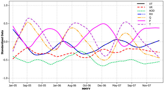 For ease of analysis, the values of the climatic variables P, T, VT, Q, RH and AOD were smoothed and standardized to between −1 and +1 (Figure 11). The relationships between P, T, RH, VT, AOD and Q can explain the variations in visibility in terms of subsidence and uplift of the aerosols. The relationship is shown to be seasonal, with highest visibility in summer and lowest in winter. Overall, VR increases with decreasing P, RH and AOD. This is because low pressure generally makes the atmosphere unstable, generating convective winds, which may shorten the aerosol residence time whereas low RH decreases the aerosol’s scattering efficiencies by inhibiting the increase in aerosol size.