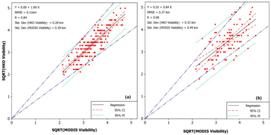 After selecting the operational satellite AOD products exhibiting the best overall representation of Bext, these are then tested for simulating VR using numerical modeling. The selected AOD products are correlated with corresponding climate data for 2005 to 2008 within a period of ±30 min of any given overpass time. Data for 2005 to 2007 are used to build an empirical model for simulating VR or Bext using the satellite-based AOD product, and data for 2008 are then used to evaluate the result. Evaluation of the model is done for both HKO and HKIA locations. Several transformations are applied to VR and Bext, as well as the independent variables (AOD, T, P, RH, ∆T, ∆P, U, V, Q, MLH, WS, VT, UT and WD) to acquire normal distributions before statistically evaluating the overall result. These transformations also attempt to contain non-linearity among parameters, where applicable. These transformations include square root (sqrt), natural logarithm (ln), square (sqr) and inverse (inv) transformations. This results in ten dependent and fifty-five independent variables, where a variable with the lowest Anderson-Darling statistics (AD value) will show normal distribution [51]. The independent and dependent variables with the highest significant correlation coefficients (p-value < 0.1) and the lowest AD values are grouped together as potential candidates for multiple linear regression, because correlation alone cannot completely imply a cause-and-effect relationship. The variable with the minimum AD value is included in the regression, because its distribution would be more normal than others. The condition of p-value less than 0.1 is imposed to select enough independent variables to be analyzed with regression modeling.