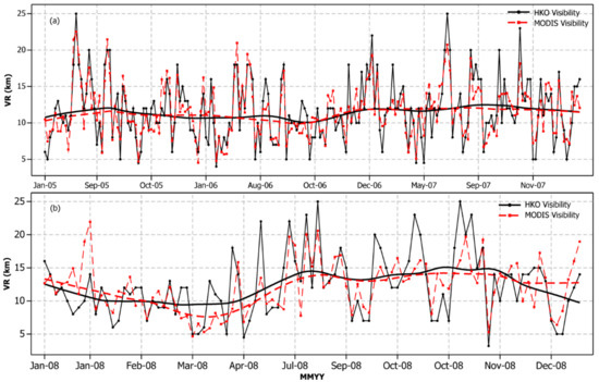 Time series of the real-time and simulated VR at HKO using Model 2 for the (a) Training data set of 2005–2007; and (b) Validation data set of 2008. Black solid line and dotted red line show the smoothed trend line for HKO and MODIS visibility, respectively.