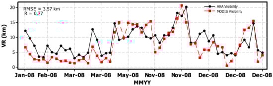 To further consolidate the results of this study, we further validated the proposed model M2 (Equation (7)) at HKIA using MODIS AOD and climatic data over HKIA (Figure 14). Model M2 performed significantly well, reproducing the variations in the observed VR at HKIA with a high correlation of 0.77 and a reasonable error of 3.57 km. We also tested another model using AOD of MISR and climatic data over HKO; as reported in the previous section, the statistics were better than for MODIS. However, this new model (Equation (8); Figure 15) for MISR did not perform better than MODIS (M2; Equation (7); Figure 12), and showed R2 = 59.91%, a predicted-R2 of 39.89% and high overestimation error (RMSE = 22.77 km) (Figure 15). The inferior result may be due to the reasons explained in Section 3.2.
