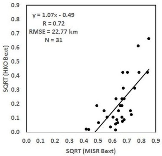 Correlation between Square root of MISR Bext and Square root of ground visibility at HKO using Equation (7) for 2005 to 2008. Black solid line is the resultant regression line and N is the total number of observations.