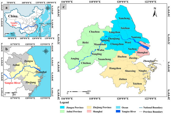 Study area. (a) The locations of Jiangsu, Zhejiang, Anhui provinces, Shanghai, and the Yangtze River in China; (b,c) the Yangtze River Delta Urban Agglomeration (YRDUA) consisting of 26 cities, eight of Jiangsu, nine of Zhejiang, eight of Anhui provinces, and the municipality of Shanghai.