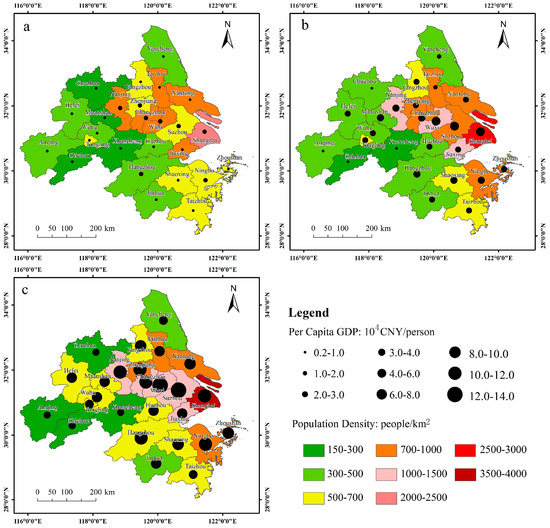 Population density and per capita gross domestic product (GDP) grading for the 26 YRDUA cities in 1995 (a), 2005 (b), and 2015 (c). The population here refers to the resident population.