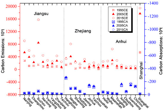 Land-use specific carbon emissions (CE) and carbon absorptions (CA) of the 26 YRDUA cities in 1995, 2005, and 2015.