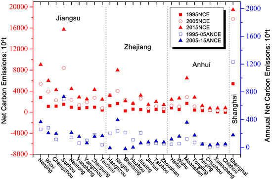 Figure 5 presents the annual net carbon emissions (ANCE) during the first (1995–2005) and second (2005–2015) decades, respectively. For most Jiangsu cities, their net carbon emissions tended to increase steadily, and their ANCE changes were smaller in the first decade than in the second decade. Hangzhou, Shaoxing, Huzhou, and Jiaxing in Zhejiang Province had equivalent net carbon emissions in 2005 and 2015, with drastic drops in their annual average net carbon emissions. Small NCE changes were observed for all the eight Anhui cities, while significant increases in annual average net carbon emissions were shown only for Maanshan, Tongling, Wuhu, and Hefei. Regarding Shanghai, its net carbon emissions increased steadily in the second decade after an obvious rise in the first decade.