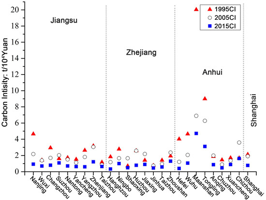 It is interesting that the highest carbon intensities were observed for Maanshan and Tongling, much larger than those for the other 24 cities, particularly in 1995 (Figure 7). This could be explained by the fact that both Maanshan and Tongling are typical mineral resource-based cities. The economic accumulation of resource-based cities is mainly based on the exploitation of large quantities of raw resources [55]. Resource-based cities in China are usually characterized by a heavy economic dependency on the exploitation and consumption of large quantities of raw resources [55]. Maanshan and Tongling have large iron and copper reserves, respectively, and there are many factories related to steel, foundry, machinery, and so on. In earlier decades, low efficiency and a waste of resources were serious in these industries due to technological limitations and carbon intensities of the two cities being high in the 1990s.