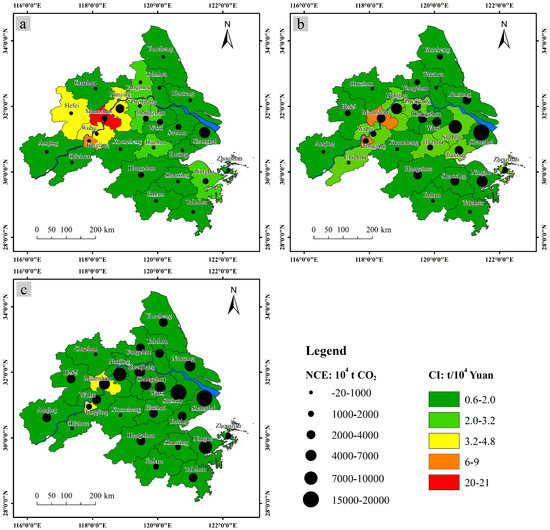 Net carbon emissions (NCE) and carbon intensities (CI) grading for the 26 YRDUA cities in 1995 (a), 2005 (b), and 2015 (c).