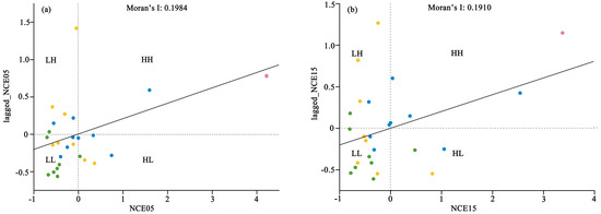 A region with a positive local Moran’s I value indicates that it has the similar values to its neighbors and the regions are called spatial clusters. In contrast, a negative value indicates the region has different values from its neighbors and the regions are called spatial outliers. Spatial clusters include high-high clusters (high value around is high) and low-low clusters (low value around in value), spatial outliers include high-low clusters (high value is low around) and low-high clusters (low value is high around) [44]. The results of all regions are shown in Moran scatter plots, while only regions that passed the significance test are shown in LISA (Local Indicators of Spatial Association) cluster maps. A Moran scatter plots has four quadrants, which are labeled as high-high (HH), low-low (LL), high-low (HL), and low-high (LH). All regions are scattered in these four quadrants based on their local Moran’s I index. Consistent with the Moran scatter plot, there are four types of regions in the LISA cluster map including high-high, low-low, high-low, and low-high regions, as well as high-high regions and low-low regions, also known as “hot spots” and “cold spots”, respectively [44].