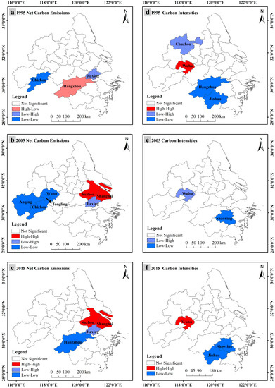 Shanghai and Suzhou were significant “hot” cities (Figure 9b,c), mainly because of rapid economic development. It has been proven that economic growth accelerates carbon emissions in China [51]. The decreasing number and shift to the southeast of “cold” cities (Figure 9a–c) were because traditional high-energy-consuming industries had gradually been relocated from eastern coastal regions to central and western provinces. This also explains why Hangzhou changed from a high-low city in 1995 to a low-low city in 2015. In 1995, there was no “hot” city (Figure 9a). Cities with the largest carbon emissions were Shanghai, immediately followed by Nanjing, and then by Ningbo and Maanshan. They were scattered, thus there was no high-value cluster.