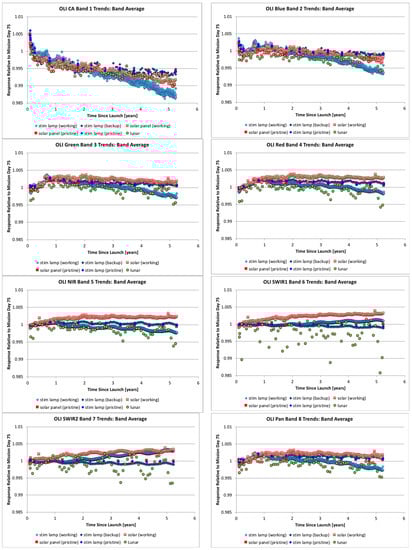 Radiometric calibration and characterization of the OLI instrument is accomplished by processing all data through the Landsat Product Generation System (LPGS) or the Image Assessment System (IAS) at the United States Geological Survey (USGS) Earth Resources Observation and Science (EROS) Center. To show the radiometric gain trend through time, the average response from each of the on-board calibrators (working lamp, pristine lamp, backup lamp, working solar diffuser and pristine diffuser) were normalized to a point in time shortly after launch. Figure 2 shows the radiometric gain trend over time. Only the coastal aerosol (~1.5%) and blue (~0.3%) bands show any significant change in gain over almost five years on-orbit.