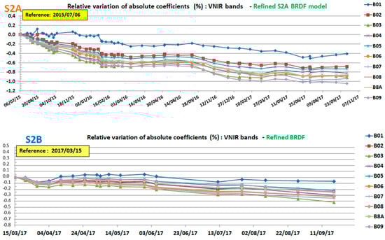 The radiometric sensitivity of Sentinel-2 MSI presents a slight decrease with time. The absolute gain coefficients decrease by about 0.1% to 0.4% for S2B over six months in space, depending on the spectral band (Figure 4, use of the refined BRDF). For S2A, the trend of sensitivity loss reaches 0.4 to 1.0% over two years and half in orbit.