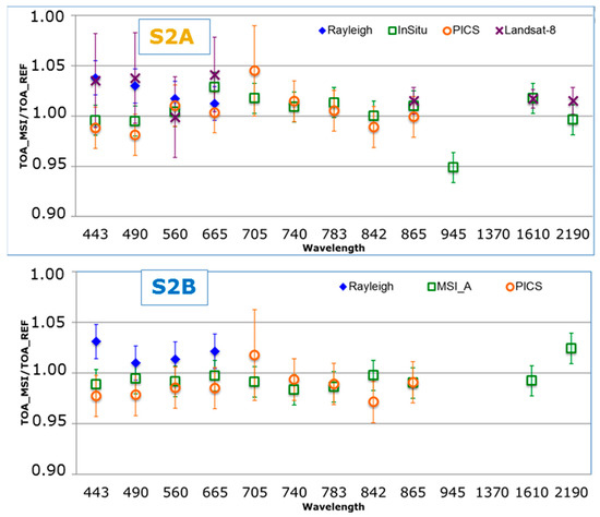 Figure 5 illustrates the results for the spectral bands of MSI-A and MSI-B. Discrepancies between the different methods are lower than 5%, which is in the range of the Sentinel-2 specifications. The desert PICS validation method shows a consistency of the absolute calibration with discrepancies even lower than 3% for all the bands, except the 705 nm band for MSI-A. Results for the in situ validation, over the Railroad Valley site, are in the same range of discrepancies. For the Rayleigh calibration, a 4% discrepancy is obtained at the maximum for the B01 band, centered at 440 nm. In this spectral range, even if the Rayleigh scattering is the strongest, the sensitivity of the method to an uncertainty on the water reflectance is important.